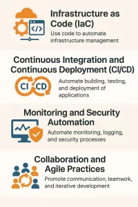 - Infrastructure as Code (IaC): Manage infrastructure configurations using tools like Terraform, AWS CloudFormation, or Azure Resource Manager.